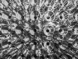 a batch of shiny metal cnc aerospace parts production - close-up flat lay with selective focus for industrial background