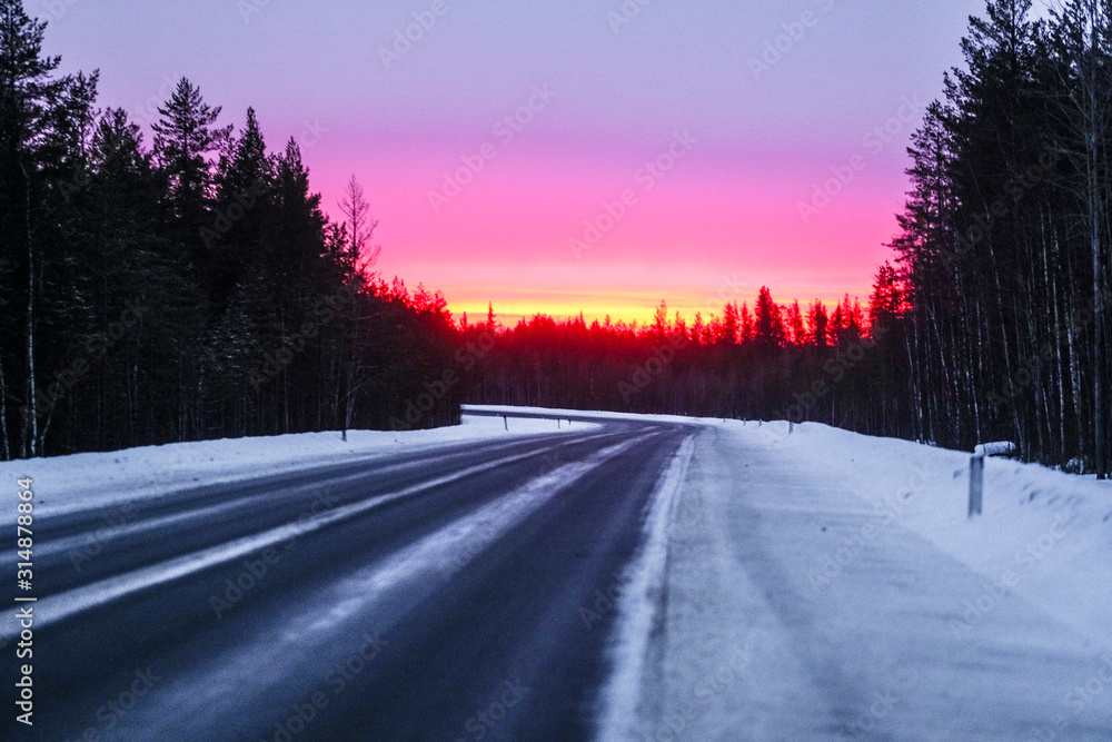 Landscape with the image of country road in Karelia at winter