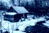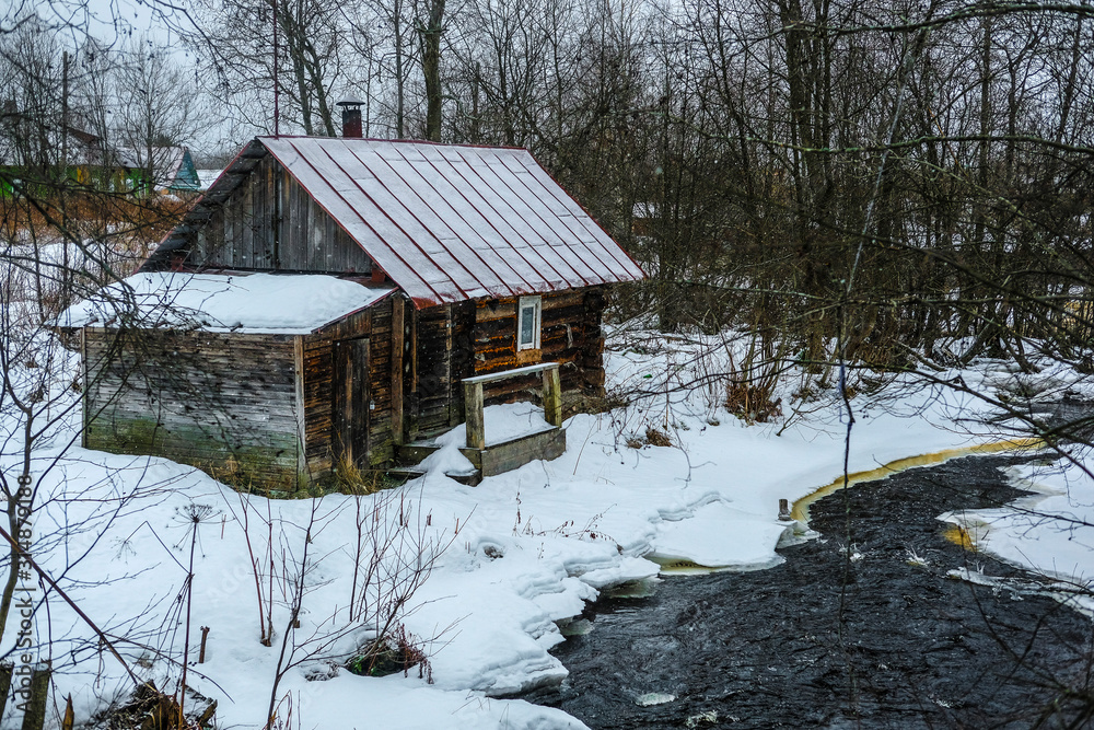 A small house on the banks of an unfinished river in Karelia in winter