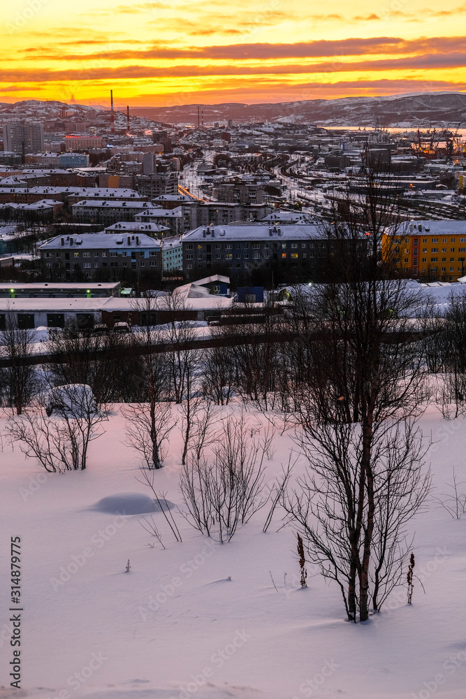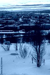 Murmansk, Russia - January, 5, 2020: landscape with the .image of Murmansk, the largest city in the Arctic, during the polar night