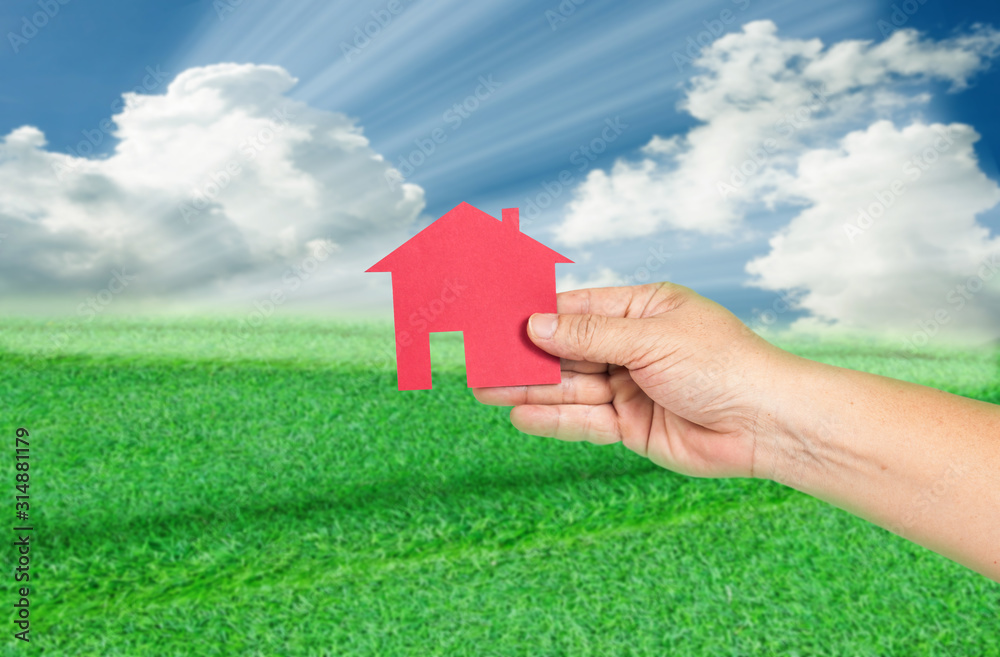 Red house in hand with landscapes background. Real estate concept.