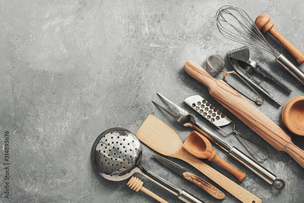 A variety of kitchen utensils and tools on a gray concrete rustic background. Top view, flat lay, copy space.