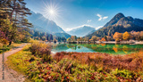Sunny morning view of Jasna lake. Attractive autumn scene of Julian Alps, Gozd Martuljek location, Slovenia, Europe. Wonderful landscape of Triglav National Park. Traveling concept background.
