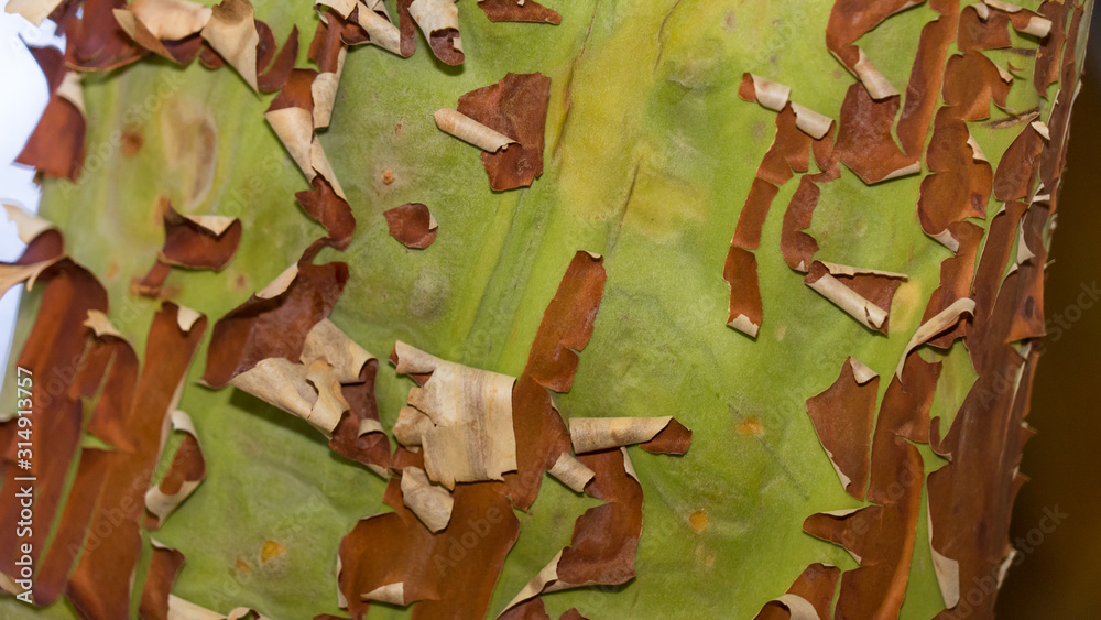 Brown bark of strawberry tree exfoliate, leaving a smooth layer with a green colour, Cyprus