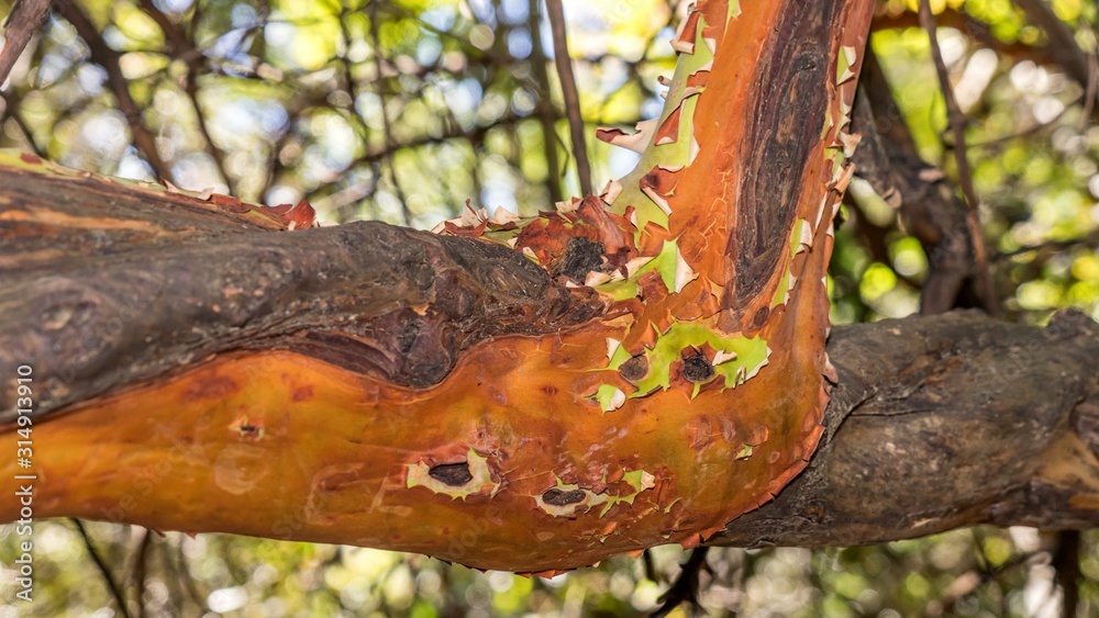 Curved, red trunks of Strawberry tree in Cyprus