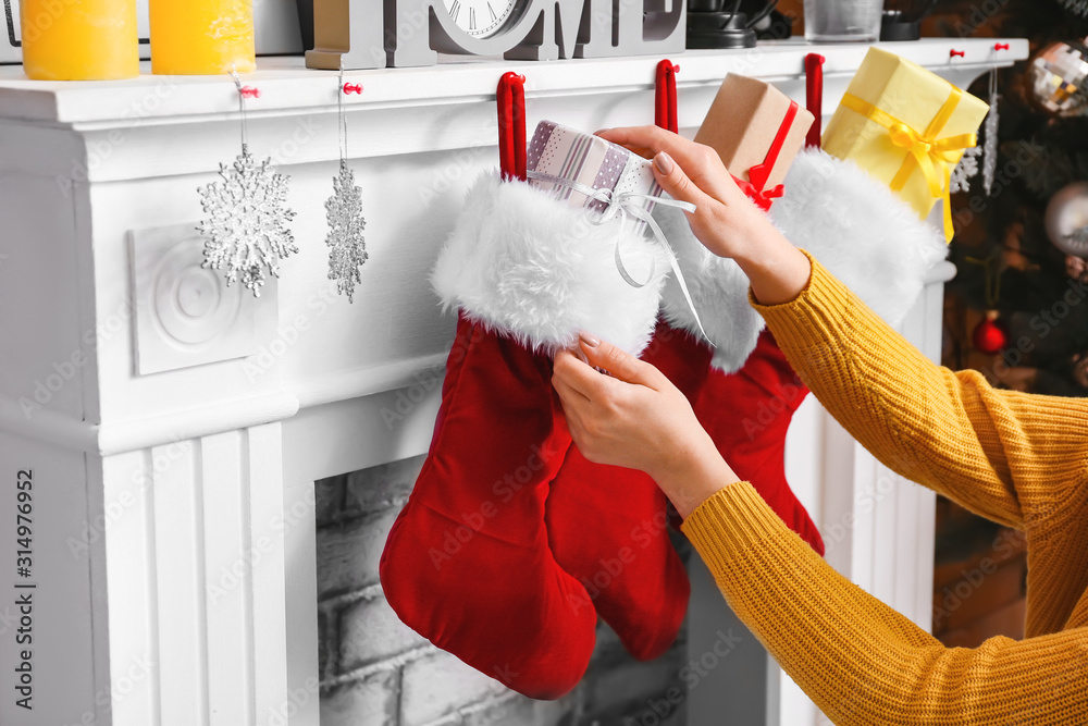 Woman putting gifts into Christmas socks hanging on fireplace at home