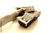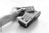 Contactless payment, paypass. Hand hold bank card near terminal on white background