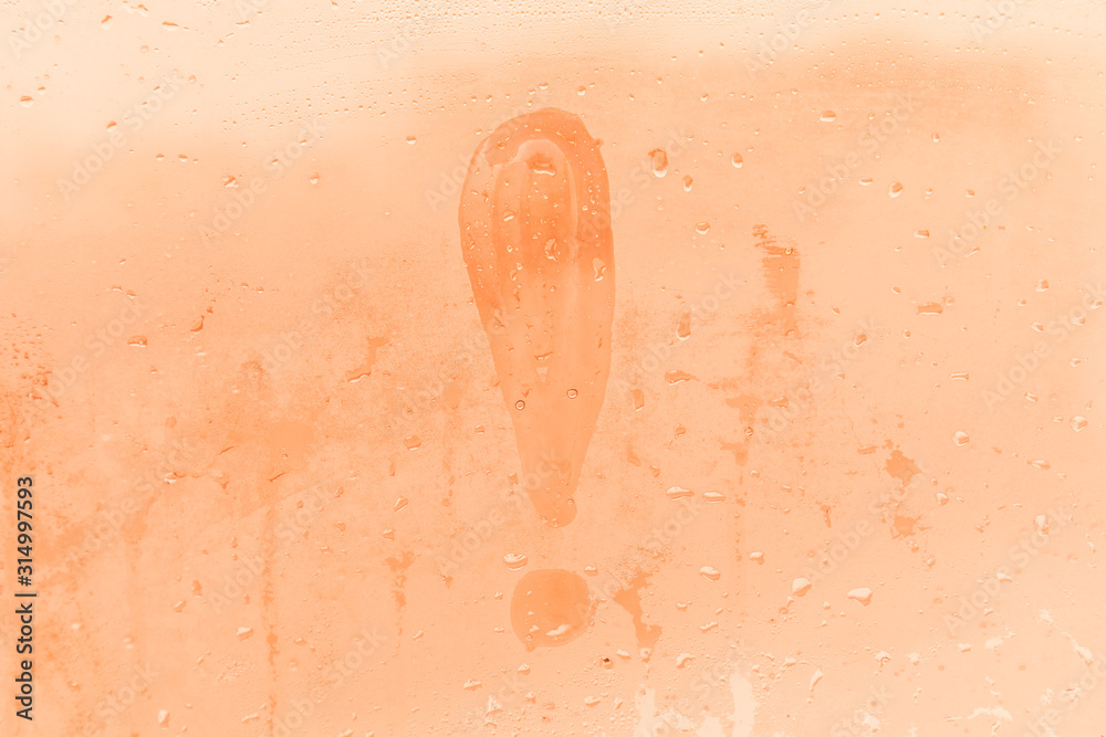 The exclamation mark or exclamation point picture or figure on the orange or pink evening or morning window glass with drops