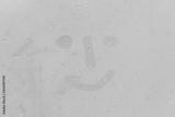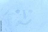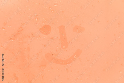 The picture or figure of the smiling face on the orange or pink evening or morning window glass with drops