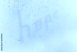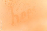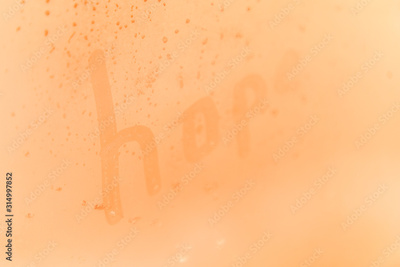 The creative child inscription hope on the orange or pink evening or morning window glass with drops