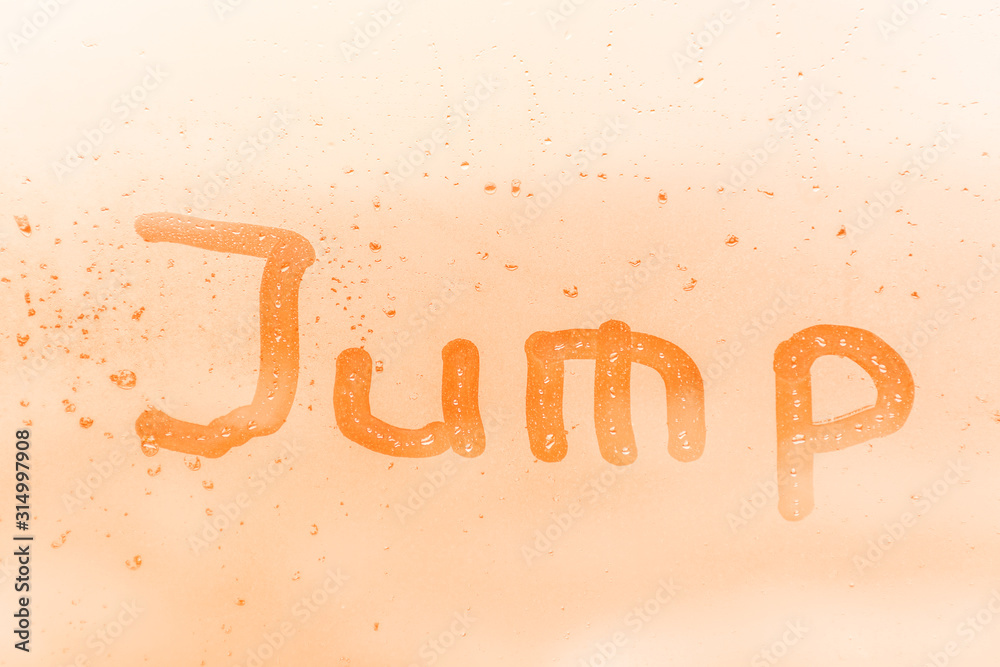 The suicide inscription jump on the orange or pink evening or morning window glass with drops