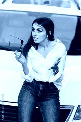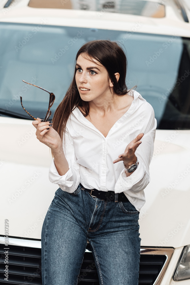 Close Up Portrait of One Stylish Young Female Dressed in Jeans and White Shirt Posing Near the Car, Business Lady, Woman Power Concept