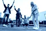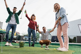 Group of smiling friends enjoying together playing mini golf in the city.