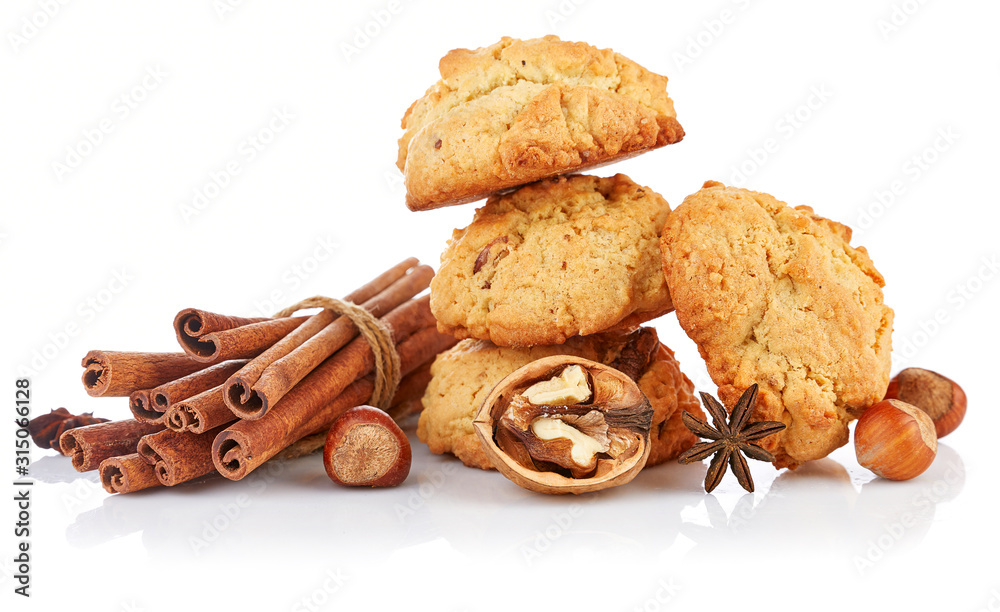 Homemade cookies with cinnamon nuts and spice. Still life of sweets and baking. Isolated on white background.