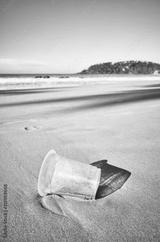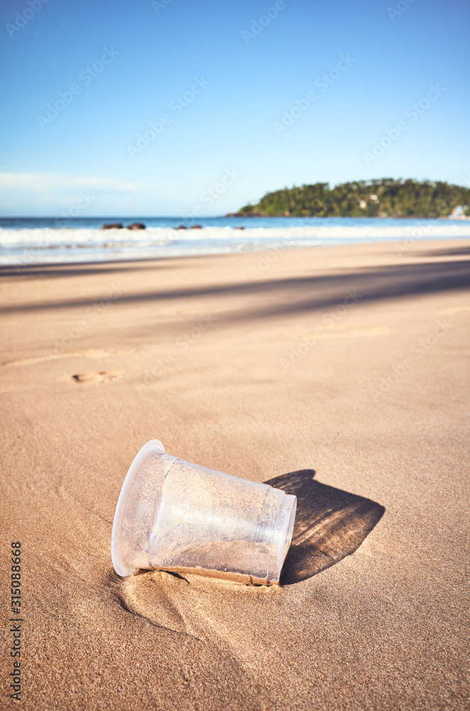Plastic cup on a tropical beach, color toning applied, selective focus.