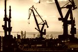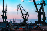 silhouettes of large port cranes