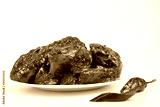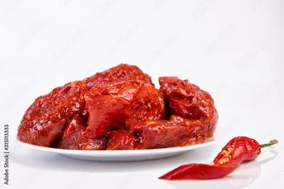 raw meat marinated in spicy sauce close-up, isolated on white background with slices pepper
