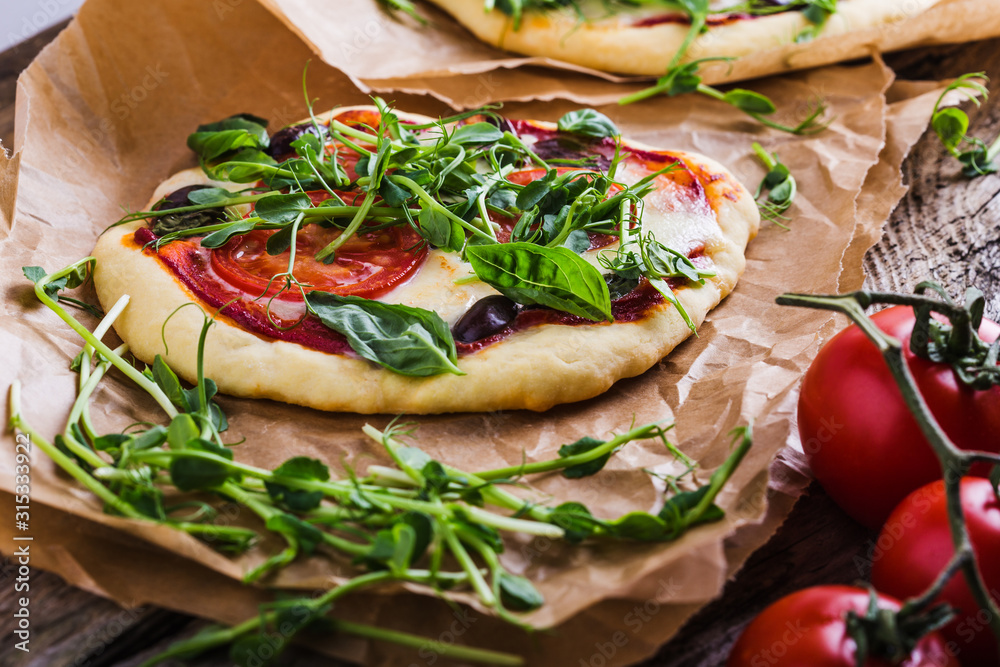 Fresh homemade Margarita pizza with tomato, microgreen and basil on rural board in craft paper
