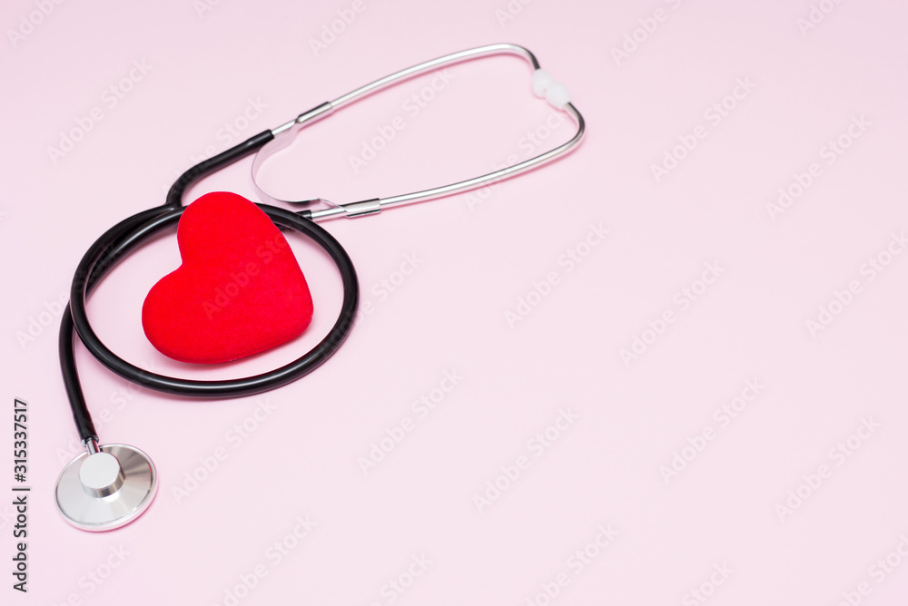black medical stethoscope with red heart on on pink background. medicine love concept. Flat lay, top view