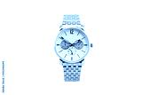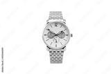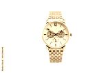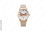 Men's gold colored wristwatch with stopwatch, classic round shape, numberless, metal strap, white clock face dial and chronometer - timer functions isolated on white background.