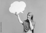 Empty speech bubble in hands of thoughful islamic girl in hijab
