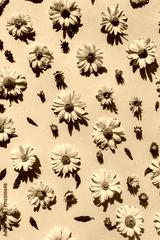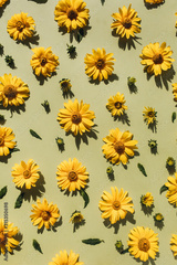 Floral composition with yellow daisy flower buds pattern texture background. Flatlay, top view.