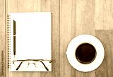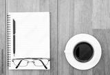 Eyeglasse and notepad with coffee cup on wood deck