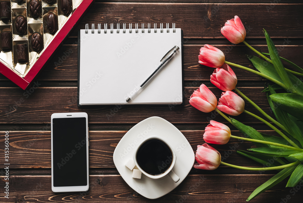 bouquet of pink Tulip flowers with a Cup of coffee and a box of chocolates and an empty notebook with a smartphone
