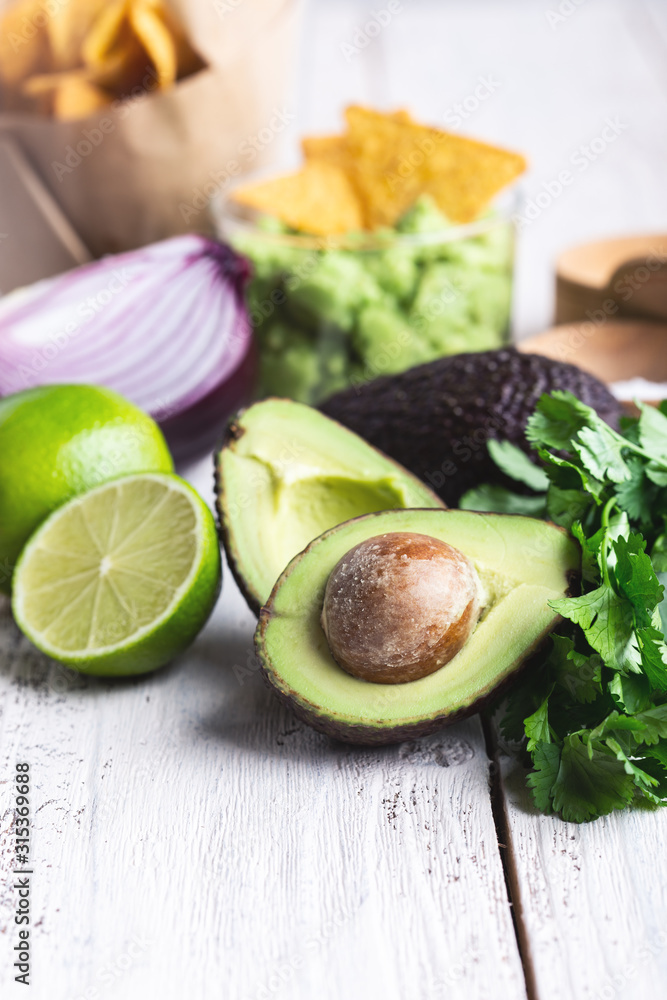 Mexican traditional food, guacamole sauce ingredients avocado, red onion, cilantro, lime and tortilla corn chips