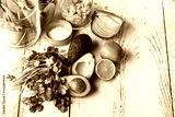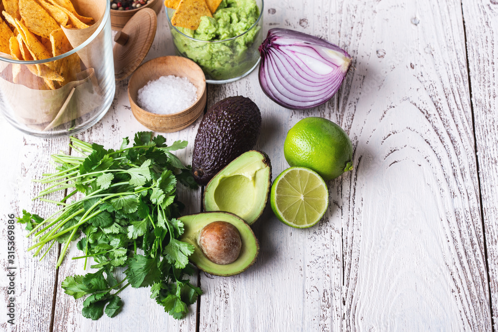 Mexican traditional food, guacamole sauce ingredients avocado, red onion, cilantro, lime and tortilla corn chips