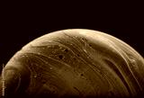 Close up macro photograph of the psychedelic rainbow of colors mixing and swirling in a soap bubble to look like a fantasy galaxy or planet isolated against a black background