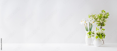 Home interior with decor elements. Spring flowers in a vase on a light background
