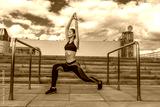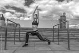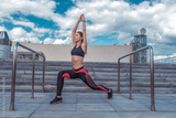 Girl in sportswear doing warm-up and gymnastics, stretching and warming up before fitness training. Summer in the city, the background of the steps of the cloud. Active woman lifestyle.