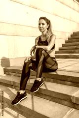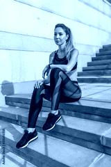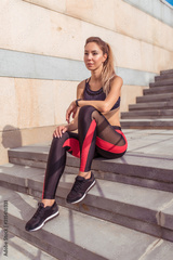 Beautiful girl morning in city, resting and sitting on steps. Front view. Fitness training active lifestyle. Tanned and athletic figure of woman. Sportswear Leggings Top. Emotions relaxation comfort.