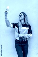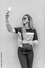 Beautiful girl summer city, hand mobile phone, beige sweater black glasses. Photographs smartphone, selfie phone, happy smiling laughs. Post social networks. Modern fashion style woman.