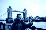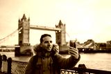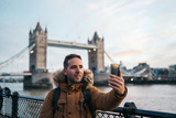 Young Man taking a photo with the smart phone to the Tower Bridge in London on a sunny winter day, London, Great Britain.