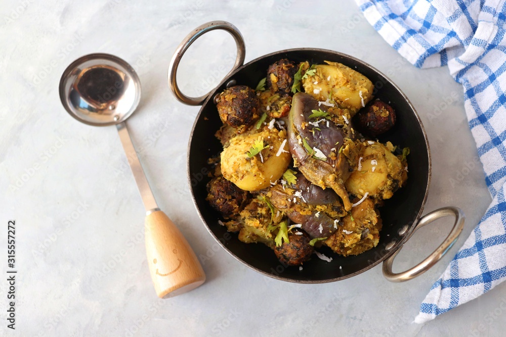 Food - Traditional Indian Gujarati dish Surti Undhiyu. Its a mixed vegetable dish cooked with stuffed brinjals, fried potatoes, Methi Muthia, purple yam, Papadi and spices. Makar Sankranti Special.