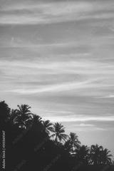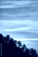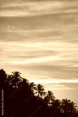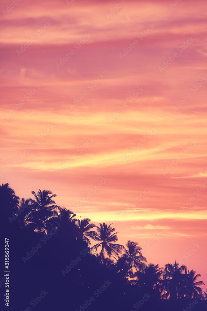 Sky with palm trees silhouettes at sunrise, color toning applied.