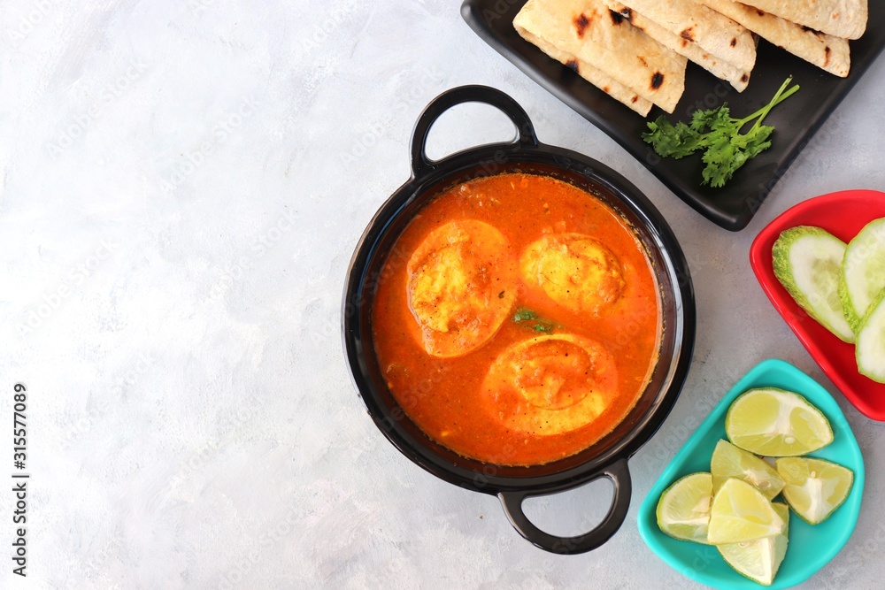 Indian non-vegetarian food- Homemade Egg Curry or Anda masala gravy, Indian spicy food, along with Roti, Lemon wedges and cucumber slices. Perfect Indian lunch. over light background with copy space.
