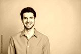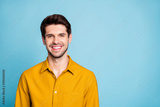 Photo of handsome creative executive director wearing yellow shirt smiling toothily isolated over blue pastel color background