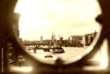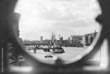 LONDON, UK , AUG 1, 2019,Looking throughfrom Tower bridge to tourist boat Cruising along the river Thames in London