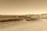 Beach with wet sand, rocks and lighthouse with blue sky. Muxia, Coruña, Galicia, Spain.