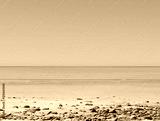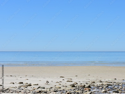 Beach with rocks, small waves, blue sea and clear sky. Galicia, Spain.