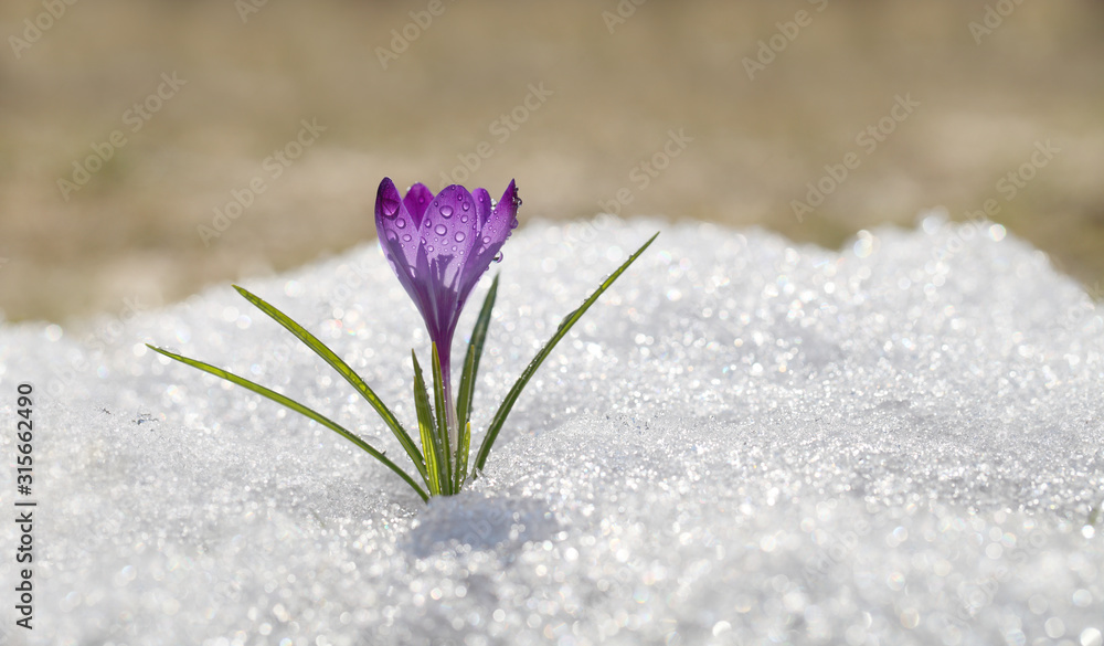 Crocuses purple blossom on a spring sunny day in the open air. Beautiful primroses against a background of brilliant white snow.