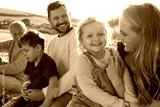 Family With Grandfather Relaxing On Beach With Flaring Sun
