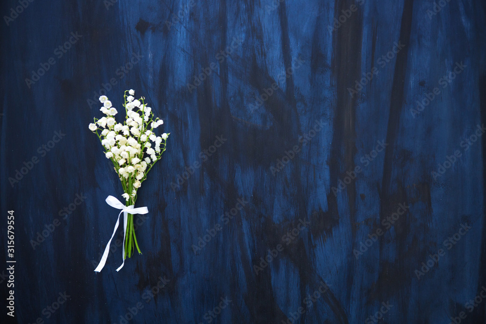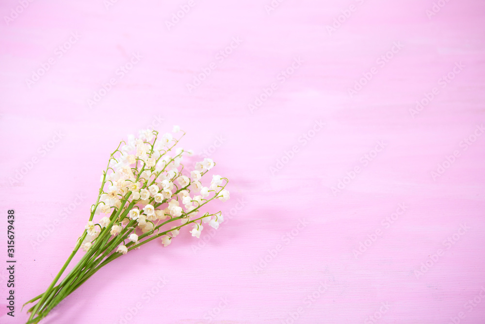 Wonderful fragrant white flowers with a delicate scent. may-lily on a pink wooden background