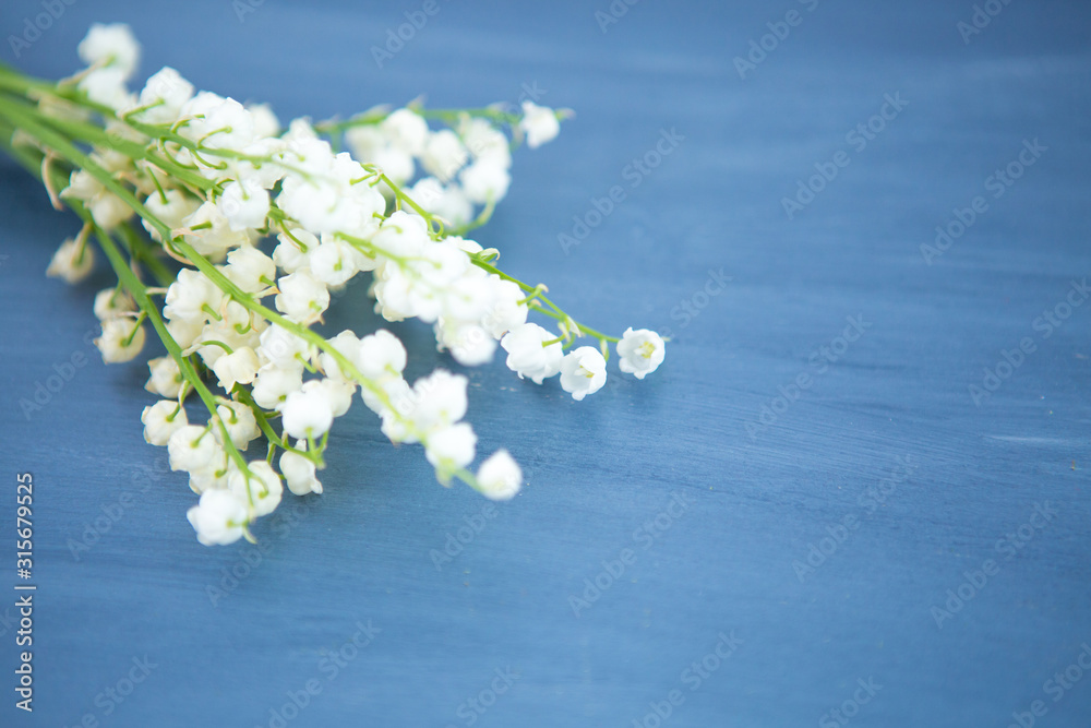 Wonderful fragrant white flowers with a delicate scent. Lily of the valley flowers on gray wooden or metal table