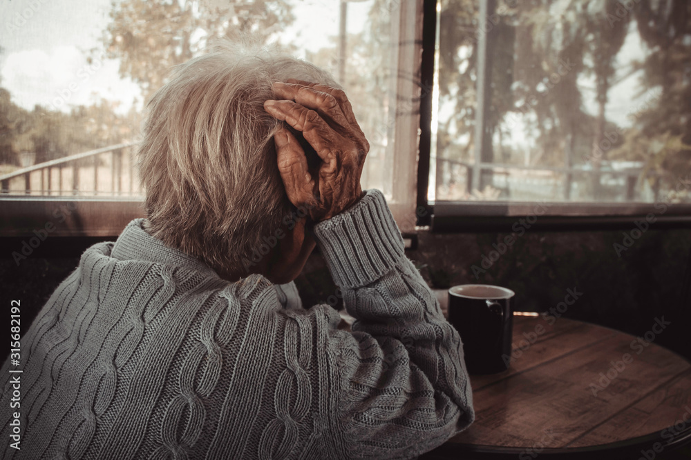 Adult woman / Old person has a headache. Concept dramatic loneliness, dementia, abuse, sadness, depression, sad emotions, cry, disappointed, healthcare, pain.