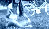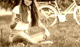 Beautiful young woman sitting on grass and using phone on vintage bicycle background in summer park.