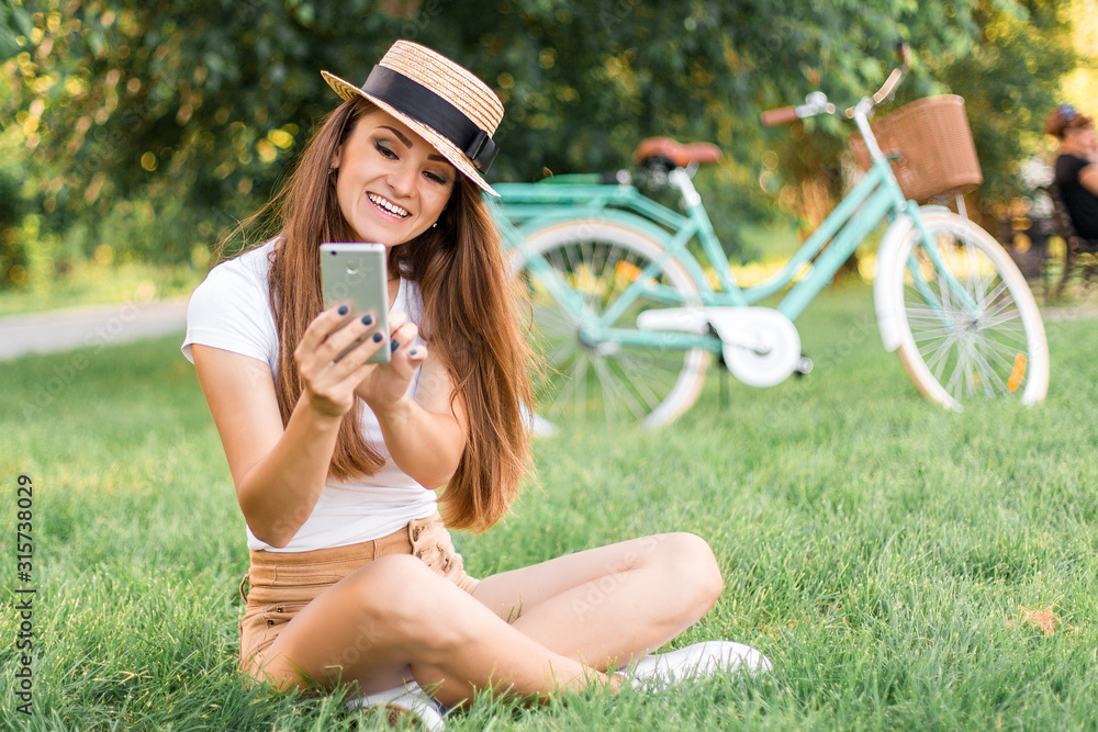 Beautiful young woman sitting on grass and using phone on vintage bicycle background in summer park.